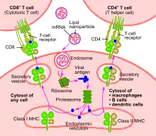 Щоб створити мРНК-вакцину проти вірусу, не потрібен сам вірус, досить мати його секвенований і розшифрований геном. Вакцинна мРНК створюється на основі короткої генетичної послідовності з геному вірусу, яка кодує білок вірусу (зазвичай поверхневий, за допомогою якого вірус проникає в клітину). Синтезована мРНК поміщається в ліпідну наночастинку, яка доставляє вакцинну мРНК всередину клітини. Усередині клітини мРНК взаємодіє з генетичним механізмом клітини, і він синтезує закодований в ній вірусний білок. Потім цей білок виходить на поверхню клітини, і імунна система організму починає на нього реагувати, в процесі цієї реакції виробляється імунна відповідь на вірусний білок[1].