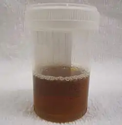 ![]() Сеча хворого з рабдоміолізом, що набула характерного коричневого забарвлення унаслідок міоглобінурії Сеча хворого з рабдоміолізом, що набула характерного коричневого забарвлення унаслідок міоглобінурії | |