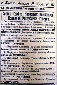 «Вчора заявили про свою відставку наркоми Донецької республіки Васильченко, Жаков і Філов, Мотиви поки невідомі. Можна припустити, що відставка відбулась у зв'язку з тим, що їхні товариші по Раднаркому не підтримали питання про переселення ченців з Покровського монастиря до Курязького»[2]