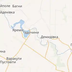 Село Радочини знаходиться на берегах річки Сухий Омельник, вище за течією на відстані 0,5 км розташоване село Яремівка, нижче за течією примикає село Демидівка. Річка в цьому місці пересихає, на ній зроблена загата.