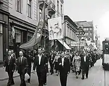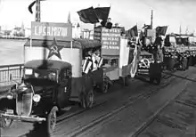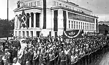Уряд Радянського Союзу запропонував уряду Латвійської Республіки укласти договір про взаємодопомогу між двома країнами. Тиск латвійських трудових народів змусив латвійський уряд прийняти цю пропозицію. Був підписаний Пакт про взаємодопомогу,[47] що дозволило СРСР розмістити в Латвії обмежену кількість підрозділів Червоної Армії. Економічні труднощі, невдоволення політикою латвійського уряду, "яка саботувала виконання Пакту і латвійського уряду", та політична орієнтація на нацистську Німеччину призвели до революційної ситуації, яка завершилася в червні 1940 р. Для гарантування виконання Пакту вступили додаткові радянські військові частини Латвія, яку вітають латвійські робітники, які вимагали відставки буржуазного латвійського уряду та його фашистського лідера Карліса Улманіса.[48] Того ж червня під керівництвом Латвійської комуністичної партії латвійські робітники провели демонстрації, і того дня фашистський уряд було повалено та сформовано Народний уряд. Вибори до латвійського парламенту були проведені незабаром у липні 1940 р. "Союз трудящих", створений за ініціативою Комуністичної партії Латвії, набрав переважну більшість голосів.[49] Парламент прийняв декларацію про відновлення радянської влади в Латвії та проголосив Латвійську Радянську Соціалістичну Республіку. Потім парламент заявив про бажання Латвії вільно та охоче вступити до СРСР, прийнявши відповідну резолюцію. Цей запит було схвалено Верховною Радою СРСР, і Латвія стала складовою республікою СРСР.