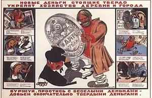 1919 року були випущені розрахункові знаки РРФСР, які мали тимчасово виконувати роль грошей. Перші радянські гроші в народі отримали назву «радзнаки» (іноді їх називали «ленінськими грошима» або «метеликами»)[29]. Радзнаки, які фактично були грошима, офіційно грошима не називалися. Вони приймалися тільки на території, контрольованій радянською владою: РРФСР, Білорусі, Туркестані, в Україні та Закавказзі. На відміну від решти випущених грошей радзнаки не визнавалися білою владою.[29] Радзнаки постійно знецінювалися, що було зумовлено їх прискореною емісією для покриття бюджетного дефіциту. За три роки (від початку 1919 року і до кінця 1921 року) купівельна спроможність розрахункових знаків знизилася більш ніж у 10 разів. Населення дуже погано ставилося до таких грошей, воліючи зберігати заощадження в купюрах царського зразка. Разом з новими грошима перебували в обігу й випуски царських часів, а також Тимчасового уряду та безліч місцевих грошових знаків[29].