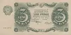 Перші радянські паперові гроші з'явилися в обігу в березні 1919 року згідно з декретом РНК від 4 лютого 1919 року «Про випуск грошових знаків 1, 2, 3-карбованцевого номіналу спрощеного типу». Вони друкувалися на щільному папері сірого відтінку форматом 33 на 43 міліметрів аркушами по 25 штук. Водяні знаки мали вигляд ромбів, утворених світлими і темними трикутниками, всередині яких були такі ж ромби, але меншого розміру. Лицьова сторона розрахункових знаків була простого оформлення. Вона містила зображення герба РРФСР у вигляді серпа і молота, обрамлених пучками колосків пшениці, на тлі сонця, що сходить. Нижче містилося комуністичне гасло «Пролетарі всіх країн, єднайтеся!». Під гербом був розташований текст «Розрахунковий знак Р. Р. Ф. С. Р. обов'язковий в обігу нарівні з кредитними білетами». На зворотній стороні містилися багатобарвні розетки з позначенням номіналу цифрами і прописом[5][30].