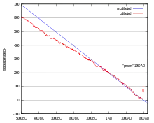 Нині для правильного застосування методу проведено ретельне калібрування, що враховує зміну співвідношення ізотопів для різних епох і географічних регіонів, а також специфіку накопичення радіоактивних ізотопів у живих істотах і рослинах. Для калібрування методу використовують визначення співвідношення ізотопів для предметів, абсолютне датування яких відоме. Одним із джерел калібрувальних даних є дендрохронологія. Виразний ізотопний слід від сонячної бурі 992 року виявлено в архівах річних кілець з усього світу[11]. Також зіставлено визначення віку зразків радіовуглецевим методом з результатами інших ізотопних методів датування. Зараз як стандартна калібрувальна крива використовується IntCal, першу версію якої опубліковано 1998 року (див. мал.)[7]. Наступні уточнені версії калібрувальної кривої, використовуваної для перерахунку виміряного радіовуглецевого віку зразка в абсолютний вік, опубліковано 2004, 2009[12] і 2013 року. Калібрувальну криву IntCal13 побудовано окремо для північної і південної (SHCal13) півкуль, вона охоплює останні 50 000 років і отримана на підставі тисяч вимірювань точно датованих деревних кілець (останні 12 000 років), річних приростів коралів та відкладень форамініфер. Порівняння відкладень на дні японського озера Суйгецу за період з 12 000 до 40 000 років тому з інформацією, отриманою дендрохронологами під час аналізу деревних кілець, спричинило внесення поправок, які зрушили дані в минуле на 300—400 років[13][14]. Калібрування для морських об'єктів виконують за окремою кривою Marine13, оскільки обмін вуглецю в морському резервуарі повільніший ніж в атмосферному.