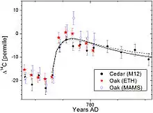 - Bronk Ramsey C. et al. A Complete Terrestrial Radiocarbon Record for 11.2 to 52.8 kyr B.P. // Science. — 2012. — Vol. 338, iss. 6105. — P. 370—374. — DOI:.