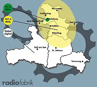 Радіофабрика транслює на частоті УКВ 107,5 Мгц, її зона покриття охоплює північні області федеральної землі Зальцбург (Фляхгау, Тенненгау, Зальцбург Зеєнланд) і сягає сусідніх округів Баварії (Траунштайн, Берхтесгаден). Окрім цього, радіостанція послуговується аналоговим мовленням на частоті 103,8 Мгц і цифровим мовленням по всій території федеральної землі під програмним номером 42 в мережі Salzburg AG, а також має пряму інтернет-трансляцію[23].