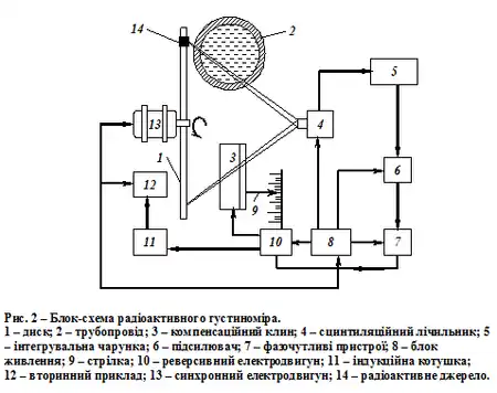 Блок-схема компенсаційного радіоактивного густиноміра наведена на рис. 2.