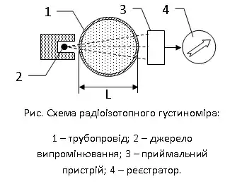 Робота основана на залежності поглинання радіоактивних випромінювань від густини пульпи (рис.). Для жорсткого гамма-випромінювання масовий коефіцієнт послаблення практично не залежить від складу твердої фази пульпи. У цих густиномірів чутливій елемент не вводиться в середину досліджуваної рідини. Вимірювання густини рідини за допомогою гама-променів можливе за поглинанням випромінювання досліджуваним середовищем або за розсіюванням випромінювання досліджуваною рідиною.