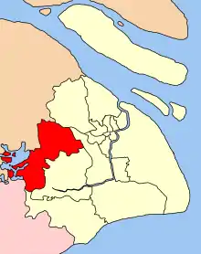 Район розташований на заході муніципалітету Шанхай. Площа району —- 675,54 км². На заході район межує з провінціями Цзянсу і Чженцзян, на сході межує з районами Міньхан і Сунцзян. На півночі межує з районом Цзядін, а на півдні з районом Цзіньшань. На території району розташовано єдине прісноводне озеро Шанхая - Даншань, звідки бере свій початок річка Хуанпу.