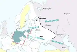 - Ленінград[7] або Петербург[8] або ж навіть Адольфсбург (нім. Adolfsburg)[9][10] — крайній північний захід Московії, що включає Новгородчину, Тверську область і Вологодчину. За іншою версією, Ленінград передбачалося «зрівняти з землею і передати Фінляндії[1][11].За третьою — Ленінградську область передбачалося перейменувати в Інгерманландію і перетворити на один із центрів німецької колонізації[9].