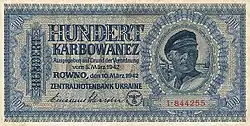 Певний період нарівні з рейхсмаркою в обігу перебували окупаційні гроші Райхскомісаріату «Україна» в карбованцях за курсом 1 марка = 10 крб. Грошові знаки друкувалися Центральним Емісійним Банком України в місті Рівне, починаючи з березня 1942 року, номіналами від 1 до 500 крб. Були в обігу лише на окупованій німцями території України паралельно з райхс- та окупаційними марками. На території генерал-губернаторства (Польща) та Райху не визнавалися. Наприкінці 1944 року відбулось повне вигнання нацистських окупантів з території України, і відповідно німецькі банкноти припинили свій обіг.