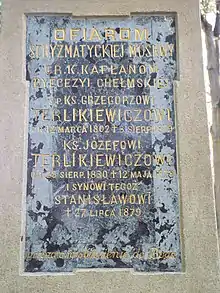 - Григорій (12.03.1802-03.08.1879) і Йосип (28.08.1830-12.05.1878) Терлікевичі – греко-католицькі капелани Холмської дієцезії, підписані як "Жертви схизматицької Москви". Григорій Терлікевич (Terlikiewicz Grzegorz, 1802-1879) народився у с. Груд на Підляшші, закінчив Духовну семінарію в Холмі, арештований та ув’язнений у в’язниці в Седльцях за опір проти розпоряджень російської влади, осуджений на висилку до Сибіру, після пом’якшення вироку змушений до виїзду з родиною до Галичини. Йосип Терлікевич (Terlikiewicz Józef, 1830-1878) народився та мешкав у с. Груд. Студент семінарії в Холмі та головної семінарії в Варшаві. Разом з ним похований його син Станіслав. Поховання знаходиться: поле IIA, західний ряд, місце зліва від Wilczków, 50.074390, 19.952144;