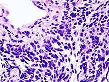 У випадку дрібноклітинної карциноми клітини містять щільні нейросекреторні гранули (везикули, що містять нейроендокринні гормони), які пов'язують пухлину з ендокринним/паранеопластичним синдромом.[50] У більшості випадків пухлини виникають у великих дихальних шляхах (первинних і вторинних бронхах).[13] Ці пухлини ростуть швидко і поширюються на ранніх стадіях захворювання. У 60-70 % випадків утворюються метастази. Цей тип раку легень в значній мірі пов'язаний з палінням.[3]
