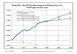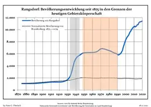 Динаміка населення з 1875 року в сучасних кордонах (Синя лінія: населення; Пунктир: відносна порівняльна динаміка населення землі Бранденбург; Сірий фон: період Третього рейху; Помаранчевий фон: період НДР)