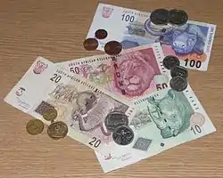 | Монети | 10, 20, 50 центів; 1, 2, 5 ранд |