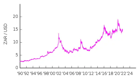 | 1 USD = | 15,03 ZAR (18 лютого 2022) |