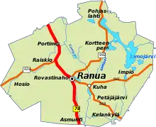 Рануа розташована за 82 км від Рованіемі, 159 км від Оулу, 635 км від Тампере і 766 км від Гельсінкі.