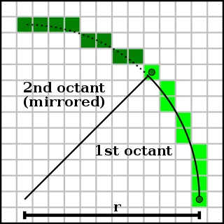 Цей алгоритм відображає всі вісім октантів одночасно, починаючи з кожного напряму (0°, 90°, 180°, 270°) і проходить в обох напрямках, щоб дістатися до найближчого кратного 45° (45°, 135°, 225°, 315° ). Алгоритм може визначити, де зупинитися, тому що, коли у = х, це означає, що кут становить 45 °. Причина використання цих кутів показано на малюнку: В той час, як змінна у зростає, вона не пропускає жодного повтору значення у до досягнення 45 °. Таким чином, під час циклу, у збільшується на 1 кожної ітерації і х зменшується на 1, також х ніколи не перевищує 1 в одній ітерації. Це призводить до зміни під кутом 45 °, тому що це точка, в якій тангенс зростання = обертанню.