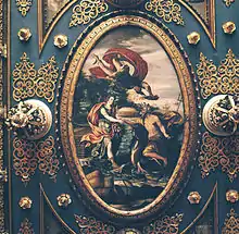 Над входом ратуші розміщений герб Гданська з двома левами. Фламандські каменярі Гендрік Лінте (Hendrik Linthe) і Корнеліус Брун (Cornelius Brun) на вершині східної стіни встановили мере́жчату балюстраду та прикрасили її традиційною геральдичною тріадою Гданська — гербами Польщі, Королівської Пруссії і Гданська.[5] На кінцях балюстради звели дві невеликі вежі. В одній з них був дзвін, що мав назву «Дзвін нещасних грішників», який дзвонив, коли засуджених вели на страту.