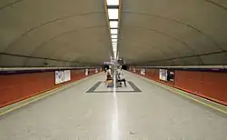 Односклепінна станція мілкого закладення з острівною прямою платформою завдовжки 120м і завширшки 10 м. Вихід на поверхню обладнано стаціонарними сходами і ліфтом для людей з обмеженими можливостями. Оздоблення в сірих кольорах з червоними акцентами на колійних стінах. На станції розташовані невеликі крамниці і банкомати . Це єдина станція, на якій немає туалетів. На станції заставлено тактильне покриття.