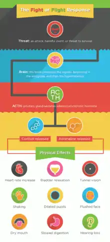 Реакція починається в мигдалеподібному тілі, що викликає нейронну відповідь в гіпоталамусі. Первісна реакція супроводжується активацією гіпофізу і секрецію гормону АКТГ.[8] Надниркові залози активуються майже одночасно (за допомогою симпатичної нервової системи) і вивільняють гормон адреналін. Випуск хімічних месенджерів призводить до вироблення гормону кортизолу, який збільшує кров'яний тиск, рівень цукру в крові, а також пригнічує імунну систему.[9] Перша реакція і наступні реакції запускаються у намаганні створити імпулсь енергії. Цей заряд енергії активується адреналіном зв'язування з клітинами печінки, і наступним виробництвом глюкози. Крім того, циркуляція кортизолу призводить до перетворення жирних кислот на енергію, яка готує м'язи по всьому тілу для реакції (відповіді). Гормони катехоламіни, такі як адреналін (епінефрин) і норадреналін, сприяють негайній фізичній реакції, пов'язаній з підготовкою до вимушених м'язових дій. Окрім цього спостерігаються[10]: