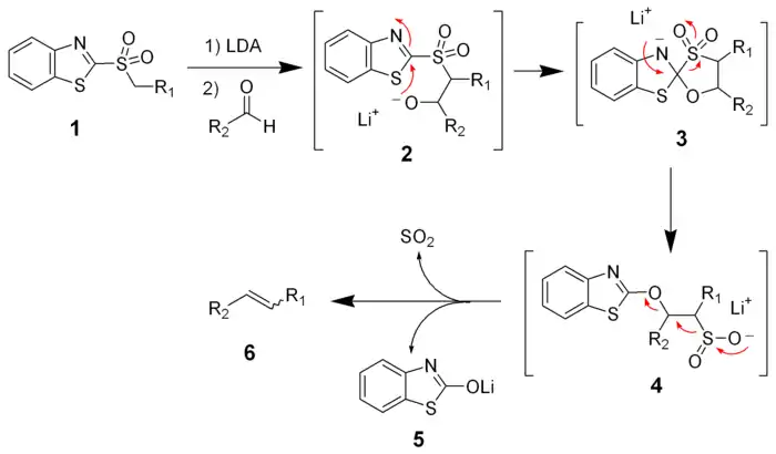 Заміщення фенілсульфонів на гетероарилсульфони значно змінює шлях проходження реакції[5]. Показовим прикладом є бензотіазолсульфон[6]. Реакція бензотіазолсульфону 1 з Літій диізопропіламідом дає метилбензотіазоліл сульфон, який швидко реагує з альдегідами (або кетонами) з утворенням алкоксидного інтермедіату 2. На відміну від фенілсульфонів, такі алкоксидний інтермедіат 2 є нестабільним та піддається перегрупуванню Смайлза з утворенням сульфінатної солі 4[7]. Остання одразу ж розкладається на діоксид Сульфуру та бензотіазолон Літію 5 даючи бажаний алкен 6.