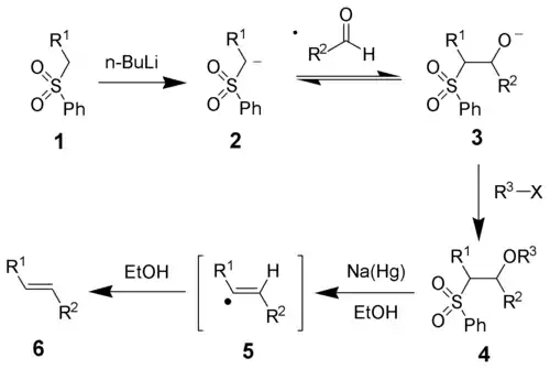 Реакція проходить через такі основні стадіі: 1) приєднання α-метилфенілсульфонату до альдегіду або кетону; 2) ацилювання отриманого β-алкоксисульфонату; та 3) відновного відщеплення β-ацилоксисульфонату (з допомогою амальгами натрію або SmJ2) для отримання бажаного продукту.