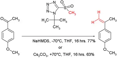 Після аналізу кількох гетероароматичних активаторів, стало зрозуміло, що не всі гетероарилсульфонати однаково впливають на вихід продукту та стереосективність[5]. Бензотіазол-2-іл сульфони реагують з α,β-ненасиченими або ароматичними альдегідами з утворенням спряжених 1,2-дизаміщенів (Е)-алкенів. Кочинські (англ. Philip J. Kocieński) помітив, що 1-феніл-1Н-тетразол-5-їл сульфон дає неспряжені 1,2-дизаміщені алкени з високим (Е)-селективним виходом, якщо немає значного стеричного напруження в молекулі[8].