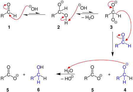 Реакція проходить у присутності концентрованих лугів, за кімнатної температури. Першопочатково відбувається приєднання OH-групи до альдегіду (1→2). Аніонний комплекс атакує атом Карбону іншої альдегідної молекули, тим самим полегшуючи перехід протону. Паралельно відбувається зсув електронної густини і утворення алкоголят-іону (3→4, 5). Оскільки алкоголяти є сильнішими основами, аніж карбоксилати, то утворюється відповідний спирт (6).
