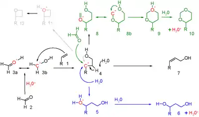 R2C=CH2 + H2C=O — H+→ [R2C+–CH2–CH2OH] — H2O→ R2C(OH)(CH2)2OH