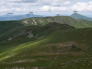 Вид на г. Ребра (у центрі), Петрос (ліворуч), Говерла (праворуч) з г. Бребенескул