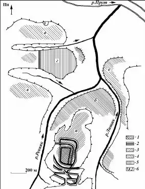 План Ревнянського городища Х ст.: 1 – дитинець; 2 – укріплена лінія; 3 – селище-супутник; 4 – сільські поселення; 5 – пасад; 6 – язичницьке святилище; а – Городище; б – Підгородище; в – Гевда; г – Царина; д – Микулинка; е - Лищик | ||||