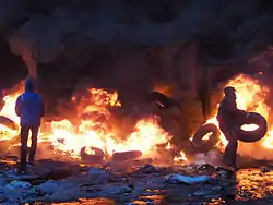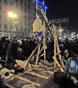 - Мітингувальники забарикадували Український дім на Європейській площі. Архів оригіналу за 1 лютого 2014. Процитовано 25 січня 2014.