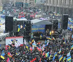Революція гідності[3] (також Єврореволюція[4][5][6]) — політичні та суспільні зміни в Україні з 30 листопада 2013 до лютого 2014 року, викликані протестом громадян України проти протиправного розгону мирної акції студентів та громадських активістів, яка розпочалася 21 листопада 2013 як спротив проти відходу політичного керівництва країни від законодавчо закріпленого курсу на Європейську інтеграцію та подальшою відмовою від цього курсу (див. «Євромайдан»). Одними з головних причин протестів стали надмірна концентрація влади в руках Віктора Януковича та його «сім'ї», небажання народу України миритись із перетворенням країни не лише де-факто, але і де-юре на одну з колоній Росії[7].