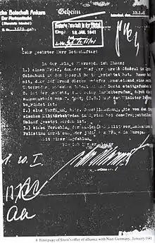 У 1940 році Лехі запропонував втрутитися у Другу світову війну на стороні Нацистської Німеччини, щоб допомогти їм вигнати Велику Британію з Палестинського мандату та запропонувати свою допомогу в «евакуації» євреїв Європи.[10] Наприкінці 1940 року представник Лехі Нафталі Любенчік був відправлений до Бейруту, де він зустрівся з німецьким чиновником Вернером Отто фон Хентінгом.