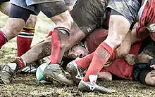 При грі вперед та інших дрібних порушеннях у основному виді регбі (регбі-15) призначається сутичка, в якій м'яч вкидається між двома групами із восьми гравців, і ті намагаються вибороти його, відштовхуючи групу супротивника.