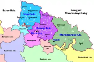 Край поділявся на три адміністративні експозитури: Ужанську (осідок в м. Ужгород), Березьку (Мукачеве) та Марамороську (Хуст). Начальником Ужанської експозитури став доктор права Юлій Дюрич, Березької — доктор права Корнелій А. Бескид, а Марамороської — Бейла Рішко, а згодом доктор права Адальберт Дудинський.