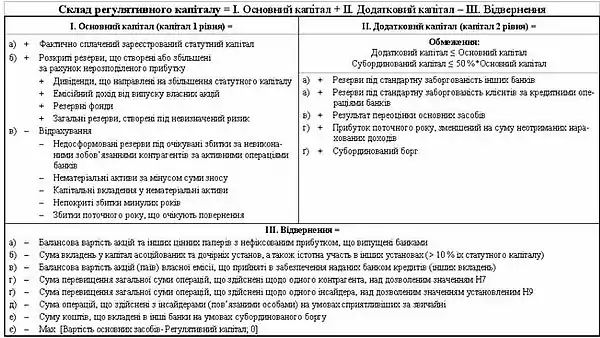В Україні склад регулятивного капіталу регламентується Інструкцією «Про порядок регулювання діяльності банків в Україні», затвердженою постановою Правління Національного банку України від 28.08.2001 N 368. Він є базою для розрахунку більшості економічних нормативів діяльності банків в Україні.