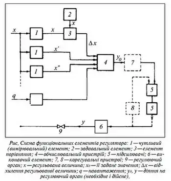 - 2) Пристрій, який змінює або стабілізує вихідну величину об’єкта регулювання за заданим законом регулювання. У автоматизованих системах керування використовують пропорційні (П), інтеґрувальні (І), пропорційно-інтеґрувальні (ПІ), пропорційно-диференціюючі (ПД), пропорційно-інтеґрувально-диференціюючі (ПІД) регулятори. За способом дії виділяють регулятори прямої і непрямої дії. Регулювальний орган регулятора прямої дії переміщується за рахунок зміни вихідного параметра без підведення додаткової енергії. При цьому давач і виконавчий механізм конструктивно поєднані. На практиці ширше використовуються регулятори непрямої дії. За видом енергії, яка приводить їх у дію, вони поділяються на: електричні, гідравлічні, пневматичні, комбіновані. За алгоритмом дії розрізняють релейні, неперервні та імпульсні регулятори. Крім того, виділяють екстремальні та стабілізуючі регулятори.