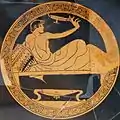 Червонофігурний вазопис. «Гра в коттаб», дно киликса, знайдений у Кьюзі. 480–460 рр. до н.е.