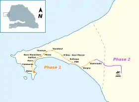 Лінія буде побудована в два етапи, перша черга охопить 36 км від міста Дакар до Діамніадіо, а друга — ще 19 км до аеропорту. Будівництво розпочалося в третьому кварталі 2016 року та має завершитись наприкінці 2023 року. [4] Першу чергу, що охоплює 13 станцій від Дакара до Діамніадіо, відкрито 27 грудня 2021 року. [5]