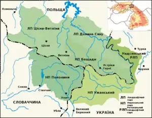 ![]() Регіональний ландшафтний парк «Надсянський» на мапі Міжнародного біосферного резервату «Східні Карпати» Регіональний ландшафтний парк «Надсянський» на мапі Міжнародного біосферного резервату «Східні Карпати» | |