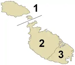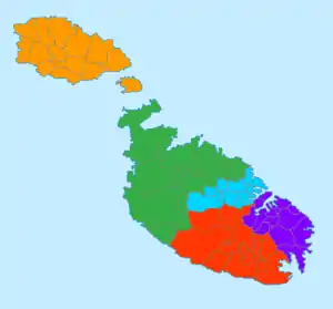 Мальта поділена на 5 регіонів (мальт. reġjuni). Три регіони були створені відповідно до Закону про місцеві ради 1993 року, і були включені до конституції в 2001 році. Два з цих регіонів були розділені на більш дрібні Законом № XVI від 2009 року, що збільшило кількість регіонів до п'яти.[1]