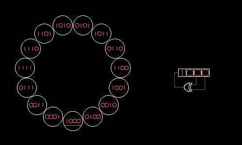 4-бітовий РЗЛЗЗ (англ. LFSR) з його діаграмою станів. XOR вентиль забезпечує для регістра зворотній зв'язок, який зсуває біти праворуч. Найдовша послідовність містить усі стани окрім стану «0000».