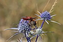 Подібно іншим редувіїдам, клоп Rhynocoris iracundus чатує на здобич біля квітів на високих стеблах. І бджола не встигла пустити в хід свій надійний захист - жало