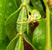 На тлі соковитої зелені забарвлення клопа допомагає йому не злякати жертву передчасно