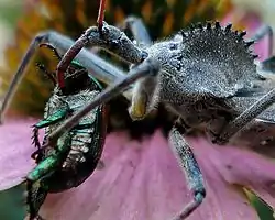 Хоботок хижого клопа Arilus cristatus Linaeus, 1763 здолав потужний панцир, яким вкрите тіло жука бронзівки, котра полюбляє харчуватися на квітах