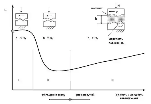 При граничному змащенні (область I діаграми), поверхні деталей контактують між собою. Товщина шару мастила значно менше величини шорсткості поверхонь. Тертя між ними зумовлене властивостями мастильного матеріалу відмінними від об'ємних. Знос поверхонь залежить від фізико-хімічних взаємодій, що відбуваються на плямах фактичного контакту поверхонь.