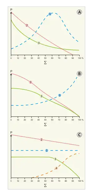 Цифри: 1 — газовий фактор, м³; 2 — тиск флюїду в колекторі, МПа; 3 — видобуток нафти, т/добу; 4-видобуток води, м³/добу. Букви: А — Режим розчиненого газу; В — газонапірний режим; С — водонапірний режим; Σ — сумарний видобуток, %.