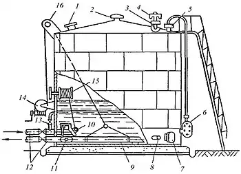 Перепускний пристрій 13 служить для вирівнювання тиску нафти з обох боків кришки закривки. Його встановлюють на резервуарах висотою більше 6 м.